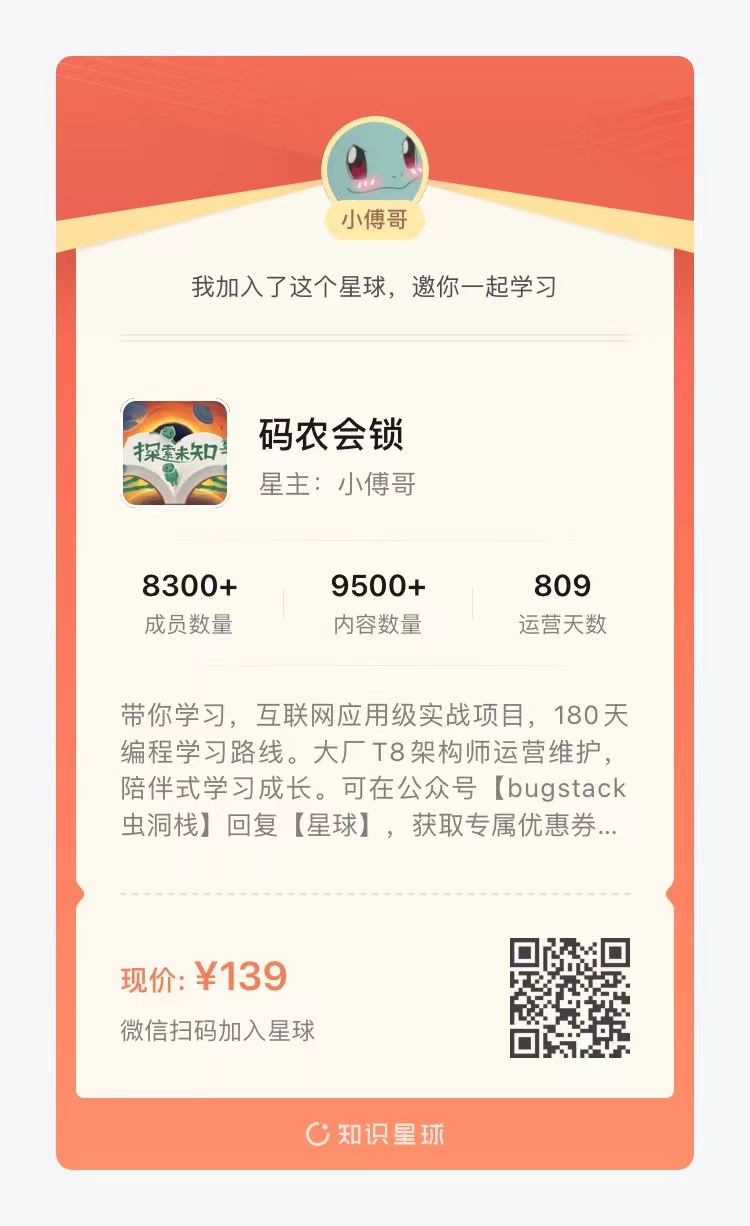 + +>星球内的伙伴可以加入VIP技术交流群,还可以进入每个项目的专属项目群。在这个过程中吸收项目经验,学习各个大佬的编程思维和开发技巧。此外在新项目中加大了视频带着写代码的部分,让读者可以知道小傅哥是如何编写代码的。—— 嘎嘎牛批! + +## 五、加入星球 + +最后,欢迎👏🏻伙伴们加入小傅哥的星球「码农会锁」,与1万+的伙伴们一起开卷! + +星球现在的价格为~~159~~元(-20)一年,老用户第二年续费是价格为5折。首次加入即可获🉐星球所有的项目和学习资料,第二年的续费只相当于续费新项目和我的服务。嘎嘎实惠!**可以说,你买小傅哥10年,都不到1000元!但却可以获得他全部的在大厂的积累的各种能力!** + +>[🧧加入学习](https://bugstack.cn/md/zsxq/other/join.html) + +伙伴说:“加入小傅哥是这一年最正确的✅的决定!” 因为我让我很多伙伴提升了技术、卷到了Offer、晋升了职级,获得了更多的收入! + +